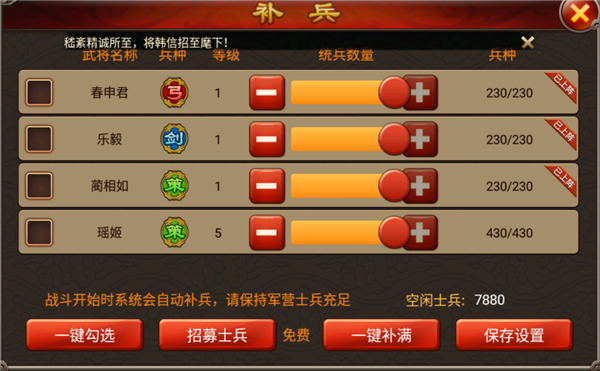 游戏中玩家所扮演的是一名君主,你需要通过战役获得君主经验、武将经验以及各种道具,以培养武将等级、搭配武器来提升队伍战斗力,升级官府、农场、矿场、军营等建筑,招募更多武将组队更多阵容体系。游戏中,玩家可自由放置战斗位置,根据位置的不同所触发的阵法也不一样,战斗效果也就随之改变。此外,还有竞技场、联盟战场、钓鱼等模式等你体验。