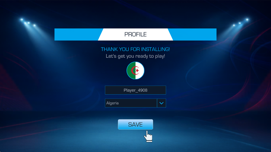1、进入足球世界杯26手游选择合适的玩家昵称,选择国家队伍,随后点击屏幕下方的“SAVE”。