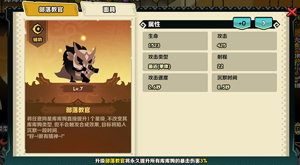 驯猪大师是游戏里初始就会送的库库姆,它的机制很特别,是只要合成就能够召唤野猪进行冲锋,而且冲锋伤害高达3200%,基本可以说大部分情况下都可以直接把一条路的敌人清理干净。