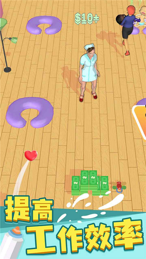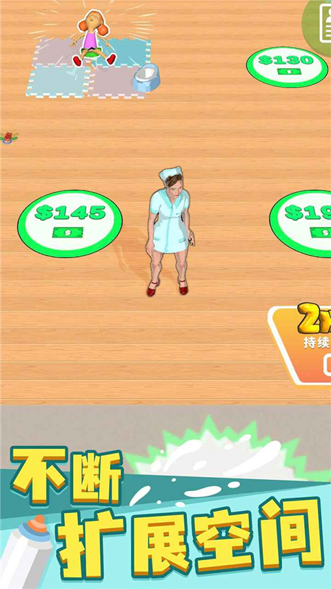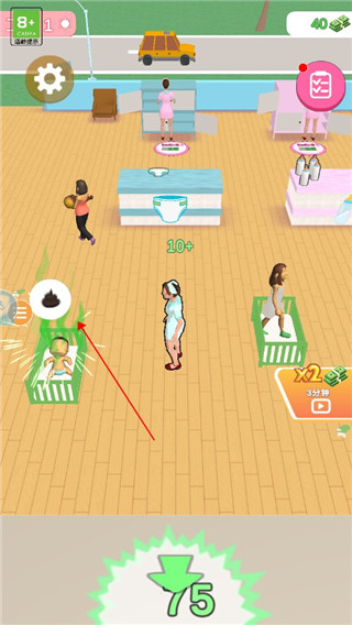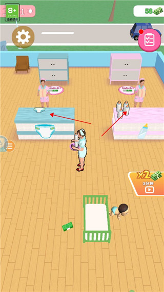 4、当你解决了问题后,就会有妈妈把孩子接走,并留下钱,走到旁边就可以捨取,获得金钱后可以移动到绿色图标上,这样会自动扣除金钱解锁新的婴儿床。