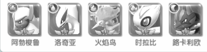 1、路卡利欧+阿勃梭鲁+洛奇亚+火焰鸟+时拉比