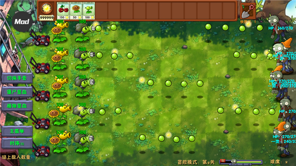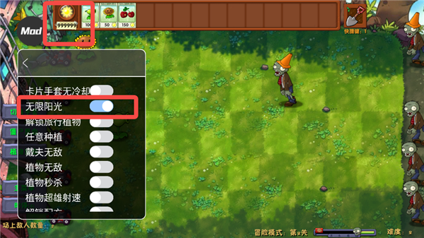 3、如开启无限阳光功能后,我们的阳光就变为99999了。