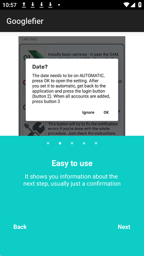 2、打开Googlefier,按屏幕提示逐步操作,应用将自动完成谷歌服务框架及核心应用的安装流程。