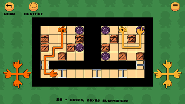 这款《握手游戏》看起来挺有意思的,简单又上瘾。玩家需要控制左右两边的手,把它们精准地移动到正确的位置,推动箱子完成各种谜题。每个关卡的设计都很有创意,难度逐渐增加,考验逻辑思维和空间规划能力。我觉得这种玩法挺锻炼人的,尤其是要同时操作两只手,还要注意它们的互动关系,稍不留神就可能失败。