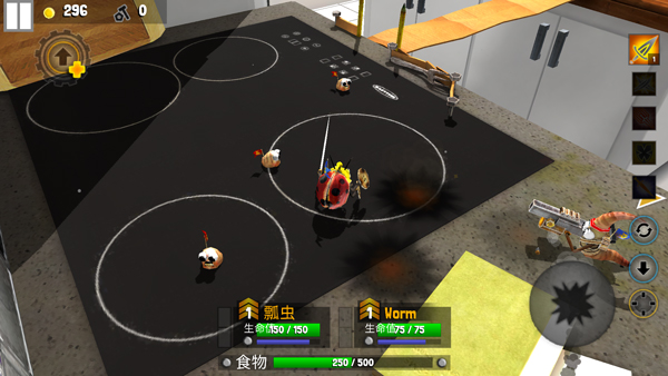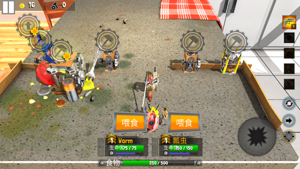 游戏中有很多可爱的虫虫角色,比如蚊子、蟑螂和蜗牛等,每个敌人都有不同的攻击方式,战斗场面非常激烈,爆炸光效和子弹横飞的场景让人感觉像在看枪战大片。游戏的操作方式是双虚拟摇杆,左边控制移动,右边控制视角,虽然对新手来说有点难,但自动攻击功能可以帮忙减轻操作负担。