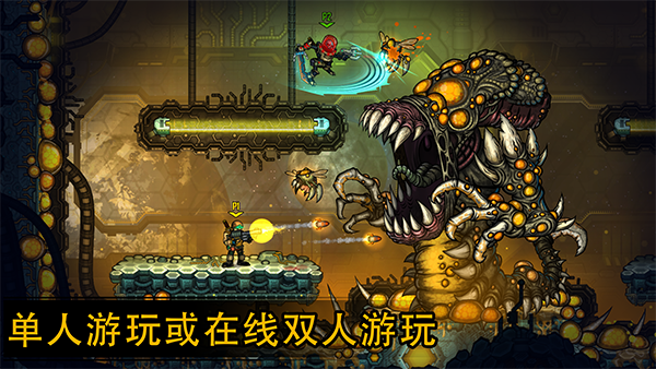 2、360°射击的平台动作游戏。像个真正的硬汉一样跳跃、冲刺、射击、斩击并把敌人炸上天吧;