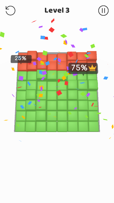游戏有超过100个关卡,难度逐渐增加,每一关都需要仔细思考和快速决策。成功的关键在于合理利用空间,让自己的方块占据更大比例,获得更高奖励。除了考验策略,游戏还注重视觉体验,填色后的图案非常美观,搭配轻松的背景音乐,带来愉快的游戏感受。