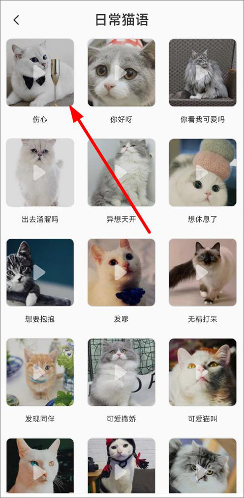 2、打开日常猫语页面,可以看到有各种类型的猫语(伤心、你好、可爱撒娇等),用户可点击播放给猫咪听;