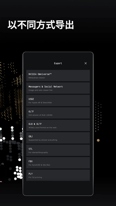 MagiScan app的工作流程极为直观,使得3D建模过程变得前所未有的简单,此外,它支持导出多种行业标准的3D文件格式,如 OBJ、FBX 和 STL,确保了模型可以无缝导入到主流的3D建模、游戏开发或3D打印软件中。无论是建筑师、设计师、游戏开发者还是3D打印爱好者,MagiScan 都提供了一个高效且强大的工具,帮助用户轻松实现物理世界到数字世界的跨越,有需要的用户可以在本站免费下载使用。