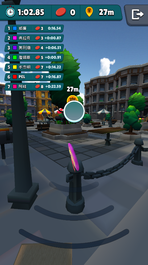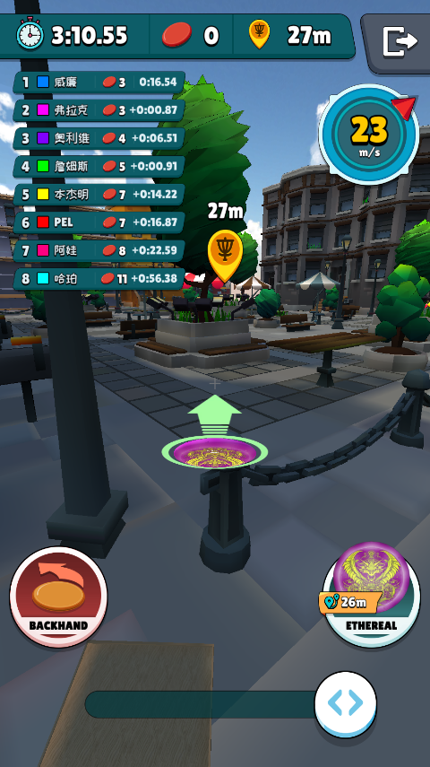 游戏的玩法挺简单的:下载安装后匹配9名玩家就能开始比赛了。裁判会提醒规则,左上角有计时器,你需要在时间内准备好投掷。滑动屏幕控制视角和方向,点击飞盘向上滑动瞄准目标,松手就能投掷了。