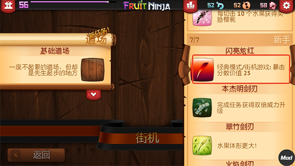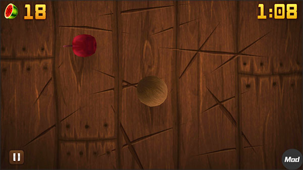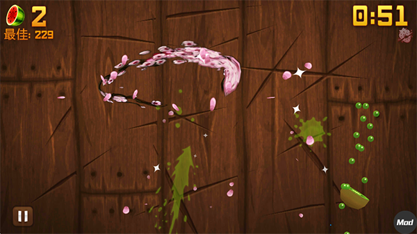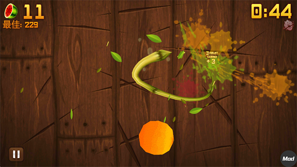 是最新的一个模式,也是花样最多的一个模式。会同时出现水果和炸弹,时间为1分钟。特别之处是,这个模式的目的同禅模式一样也是为了获取更多的分数,而碰到炸弹并不会导致游戏结束而是会减少10分。