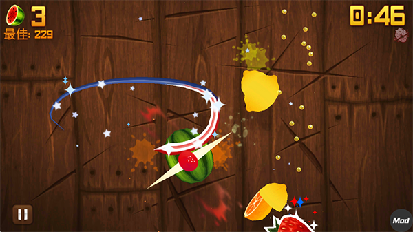 会不断出现水果,时间为一分半。在这一分半内谁因连击而切出的分数越高,谁就是胜利者。游戏不会因水果的掉落而失败。