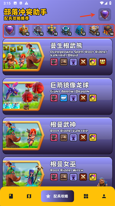 1、进入软件内我们点击下方的配兵攻略,这里可以看到诸多内容选择。