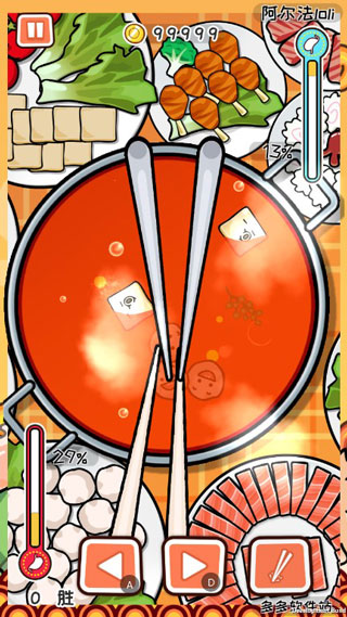 针对游戏的玩法,其实还是属于比较简单的那种,观察漂浮在火锅中的食材,利用左右移动和控制夹菜的力度获得煮熟的食材。