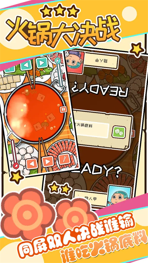 而且火锅大决战游戏操作上自由度也比较高,利用角度和力度的预判来进行夹菜,Q版卡通的界面制作,专属的角色形象制作,还有许许多多功能独特的筷子等待你来解锁,喜欢的朋友一起来吃火锅吧。另外,火锅大决战还支持双人玩家同台对抗,设置各式各样的小惩罚,例如:跳海草舞、学猫叫、请喝可乐等等,让游戏之外也能充满欢声笑语。