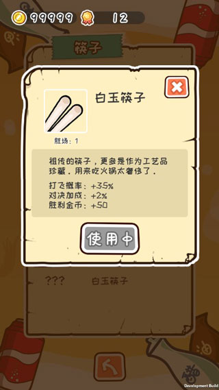 吃火锅怎能少的了筷子,筷子种类也比较多,像木筷子、铁筷子、白玉筷子等等,能够增加你的打飞改编,对决加成和胜利金币获得数量。