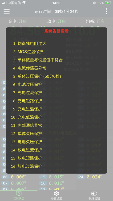 1、【参数修改】按应用场景的不同可以对电池类型、串数以及电压、电流的各项报警值进行修改。