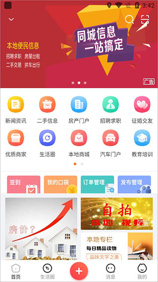 1、打开网事通软件,首页如下图所示,包含了新闻资讯、二手信息、房产门户、招聘求职征婚求职等;