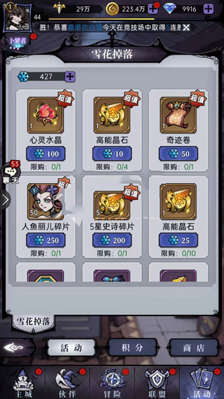 通过雪花最好兑换心灵水晶,高能晶石,人鱼丽儿碎片和伙伴经验。通过兑换心灵水晶道具,可以在心灵召唤中进行随机召唤出4~5星的伙伴。当拥有高能晶石道具后,可以在特殊召唤中随机召唤出3~5星的伙伴。