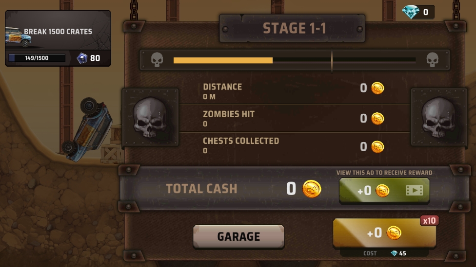 3、赚取金币并定制您的车辆,各种各样的僵尸拦截你。