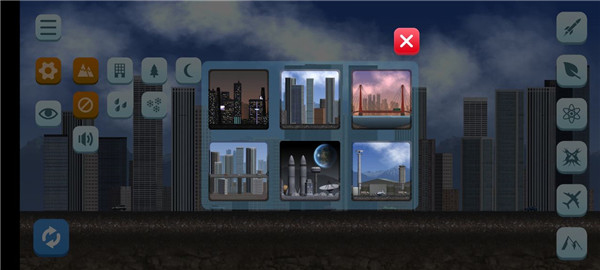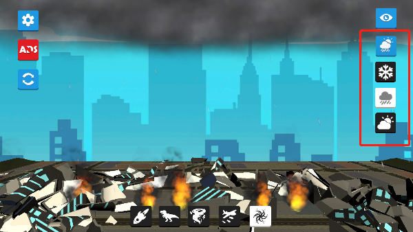 2、点击右边的那一筐选项可设置城市的天气,其中有中下雨、下雪、出太阳等个中天气等你选择,在把城市毁灭之后来一场暴雨是不是很有氛围感呢。
