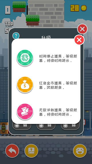 冒险模式增加三种可以升级的道具,道具在主页面消耗金币升级。