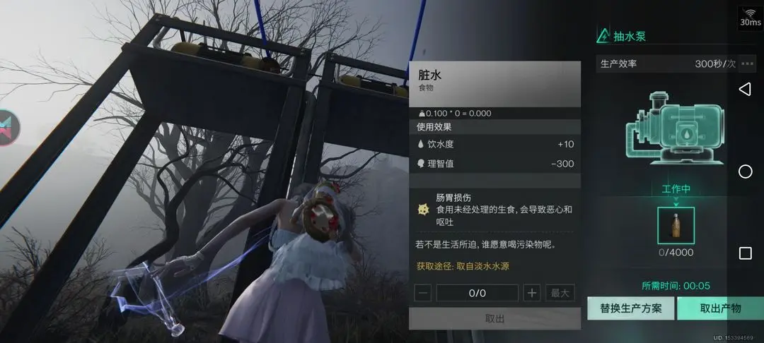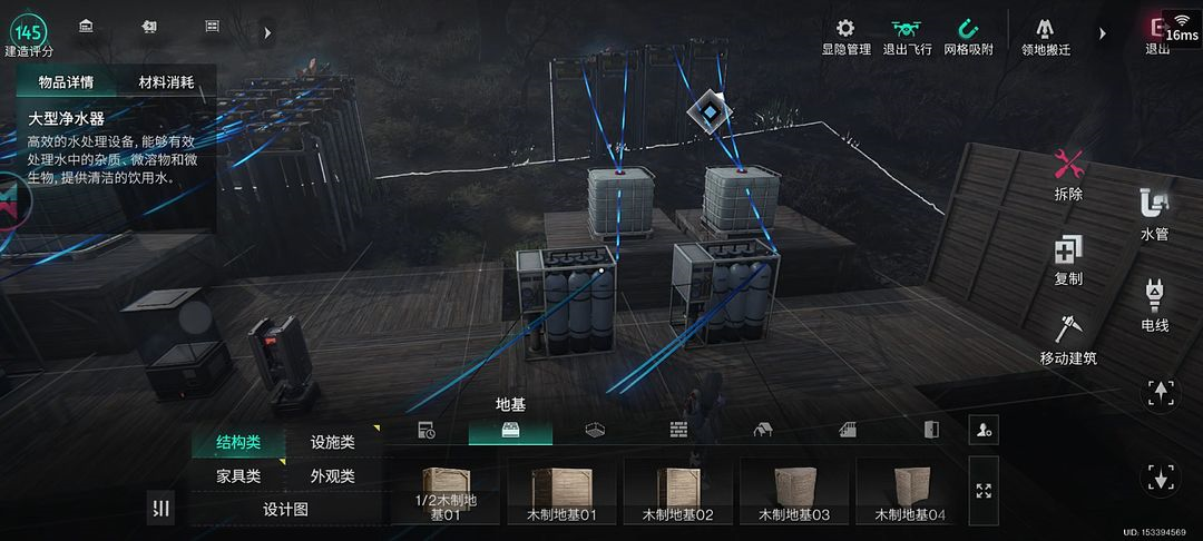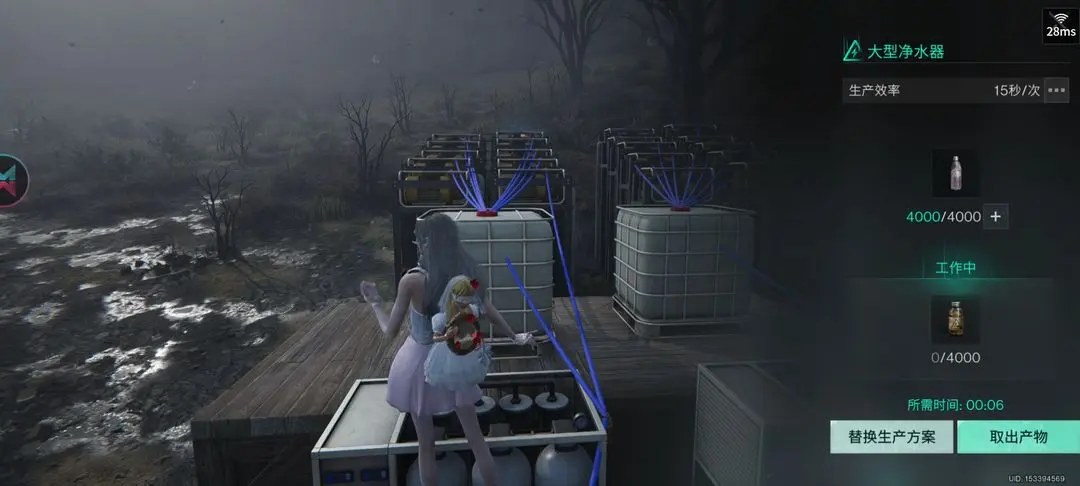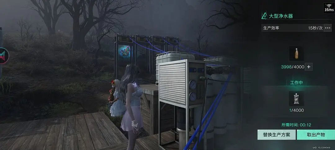 ③将上一步中连接抽水泵的蓄水桶 连接到大型净水器,同时把10台中没连水管剩下的那一台抽水泵也连到大型净水器上!设置大型净水器生产方案为练酸混合液。一共是2组。