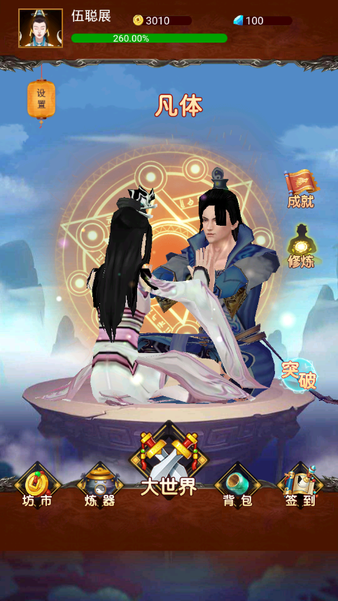 游戏中目前包含了十三大境界:凡体、练气、筑基、金丹、元婴、出窍、分神、合体、洞虚、大乘、渡劫、地仙、天仙。