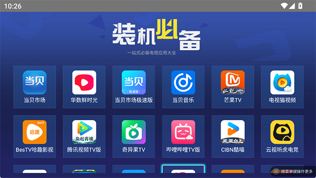 装机必备TV版是一款专为智能电视设计的一站式装机应用助手,整合了包括影视点播、直播频道、系统工具、加速优化、学习娱乐在内的大量高质量TV端应用,如当贝市场、电视家、优酷TV、芒果TV、VST全聚合、一键加速等。平台还提供每日精选推荐,自动筛选最实用、最新的电视应用,省去用户自行查找和筛选的麻烦。不仅提升了电视的使用效率,也让家庭娱乐更加丰富多样。