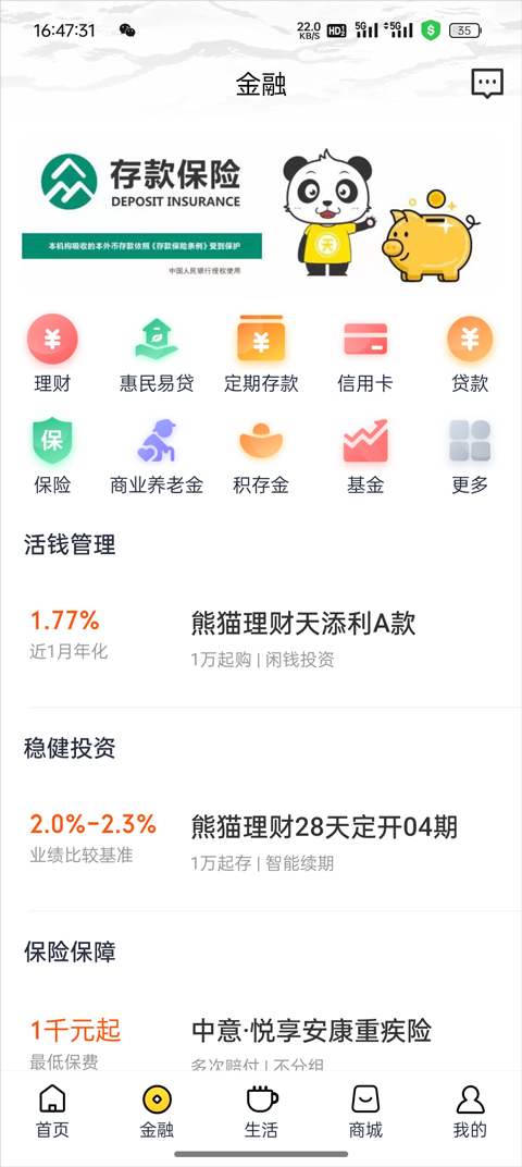 软件特色很明显:功能全面、操作简单、安全可靠,还有智能推荐和服务升级。比如首页就能快速查余额、转账、缴费,活动优惠也很明显。金融板块提供了信用卡、理财购买和贷款申请等专业服务,生活板块还能根据你的地区智能推荐便民业务,特别贴心。商城里有各种优惠商品和积分兑换,福利满满。