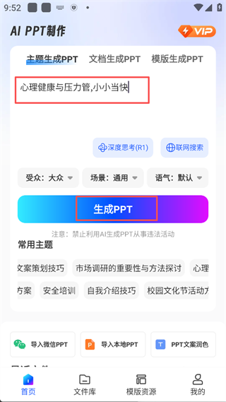 1、打开AI PPT制作师App,在首页输入主题后,可选择受众、场景并点击【生成 PPT】。