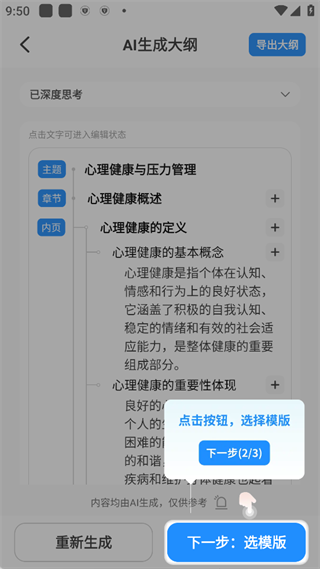 3、生成大纲完成,可编辑内容并点击【下一步、选模版】。