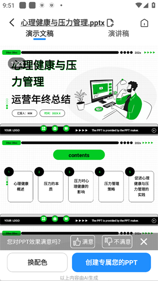 5、生成成功后可进行编辑,保存分享,更支持换配色和创建专属PPT。