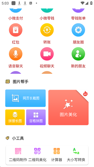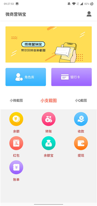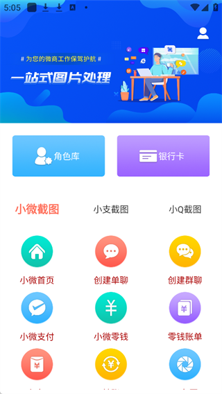 提供 “小微 / 小支 / 小 Q 截图” 等分类入口,包含 “微信首页 / 单聊 / 群聊” 等功能选项,同时集成支付、零钱等微信相关功能的截图模板,定位是为微商等场景提供一站式图片处理工具。