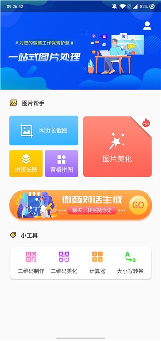 除截图生成外,还包含 “网页长截图 / 拼接长图 / 图片美化” 等图片处理工具,以及 “二维码制作 / 计算器” 等小工具,可辅助完成更多内容创作需求。