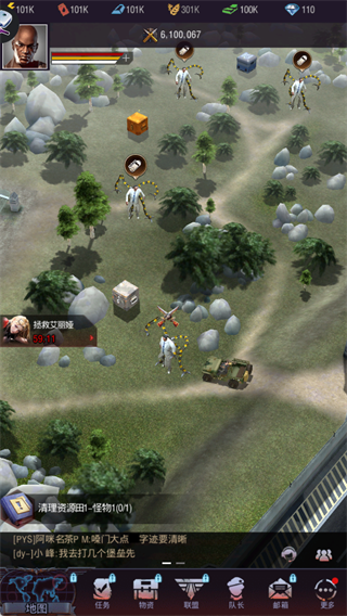 全景地图可查看资源田、怪物分布与任务点,清理怪物可获取资源,同时关注联盟聊天信息,协同盟友行动。