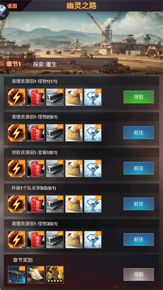 在幽灵之路章节任务中我们需要完成清理怪物、升级队长等,完成可获得资源、钻石、武器等奖励。