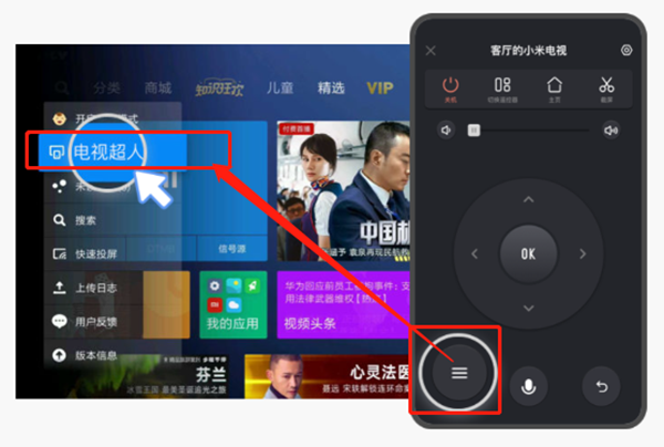 1、进入小米电视/盒子首页,点击【遥控器菜单键】,选择【小米电视助手】。