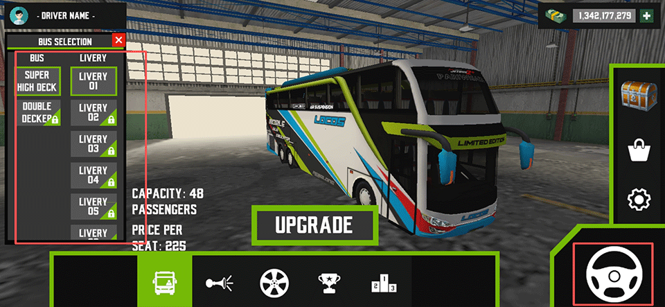 1、在游戏中首先你需要选择一辆你喜欢的巴士,然后点击右下角方向盘图标进入游戏