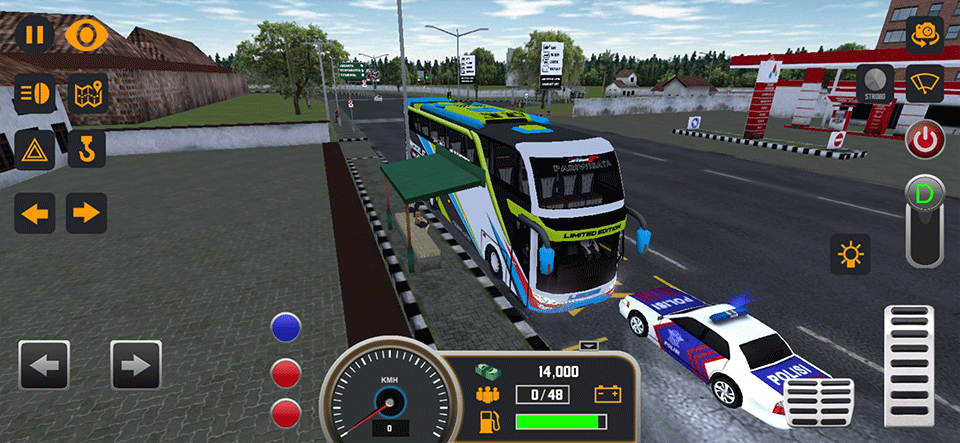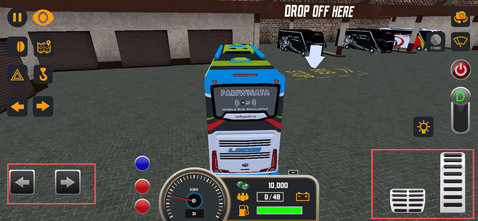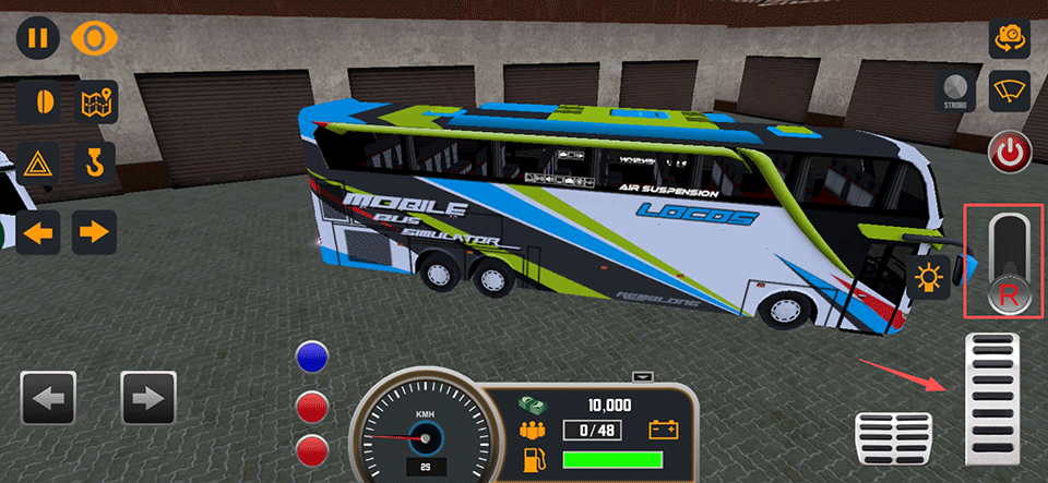 3、游戏中你将通过左下角方向键操控巴士的方向,右边为刹车和油门键