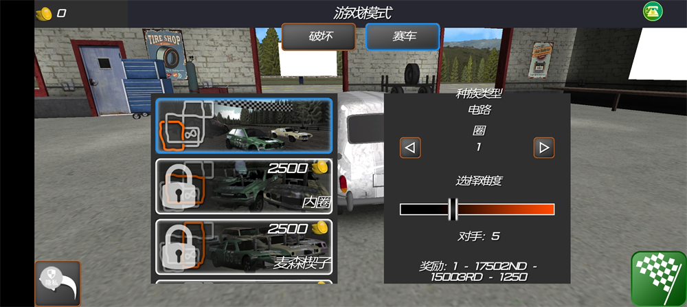 2、选择好游戏模式,“破坏”或者“赛车”以及难度和地点。