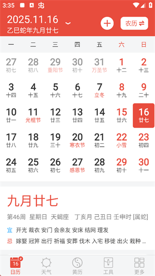 日历通App是一款集日历、万年历、天气查询、农历黄历、节气提示与日程提醒于一体的生活管理类软件。它以轻量快速、信息全面为特色,让用户能够一眼查看日期、节假日、农历与节气变化,并通过强大的提醒功能管理待办、生日与纪念日等重要事项,是一款兼具传统文化信息与现代生活便利性的高效日常助手。