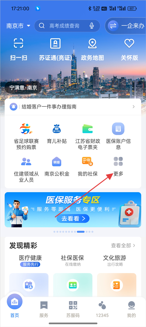 1、打开苏服办App,进入用户首页,点击【更多】按钮;