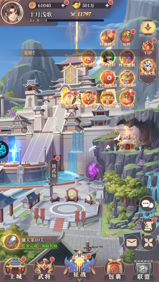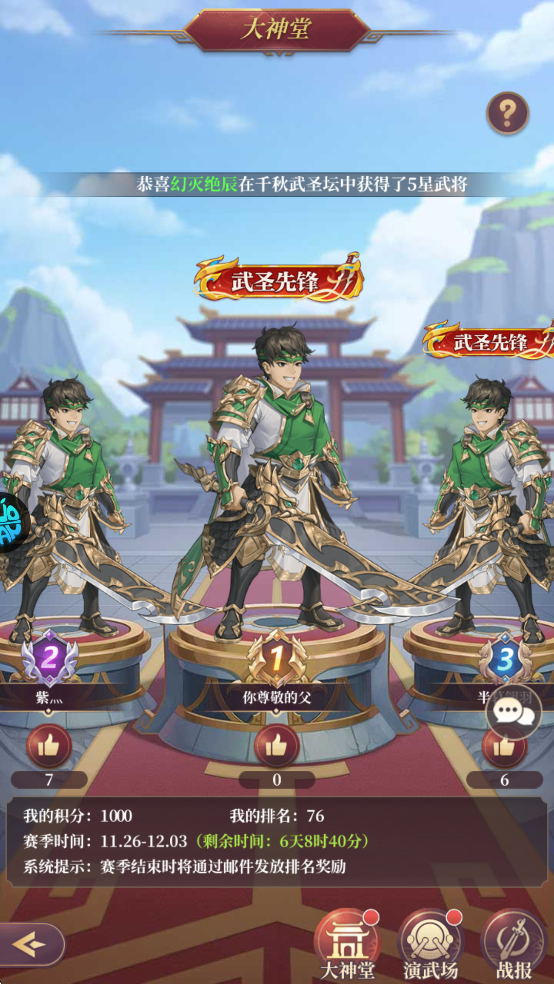 3、每七天为一个赛季,每个赛季在第七天的21:00结算排名奖励,23:59结算后的演武场积分为当前的70%,最低1000分
