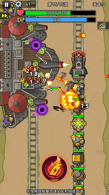 打破传统塔防的静态防御模式,火车既是炮塔的移动载体,车头还能作为攻坚武器正面撞击敌人。而且火车加速后能联动提升炮塔攻速,形成速度与火力相辅相成的对战效果,玩家需在推进和火力间做好平衡。