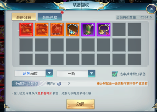 玩家可以通过BOSS大厅,或者万仙宝藏,获得对应的装备,不需要的装备可以进行选择回收,换取对应的铸币,同时铸币也可以通过其他日常活动获得哦,