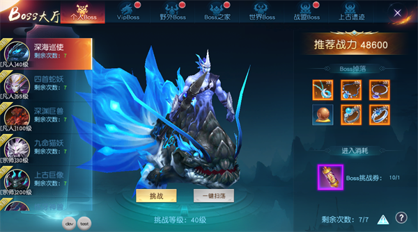 玩家等级达到40级后,可以在主界面的BOSS图标功能进入,不同玩家角色境界可以挑战对应不同的个人BOSS,分别包括了凡人40级、凡人55级、凡人100级、宗师30级、宗师200级、金刚50级