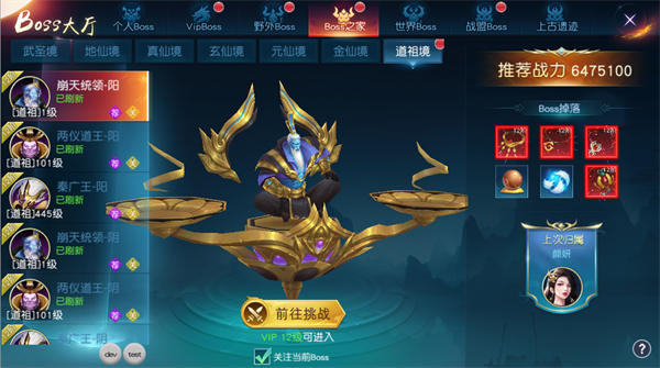 BOSS之家根据境界进行分层,总共分为10层,每一层都需要对应的vip等级和对应的角色等级方可进入。每个BOSS会有对应的境界和等级,以及官方推荐的战力推荐,所以各位上仙,建议根据自身的条件选择合理的BOSS进行挑战哦。