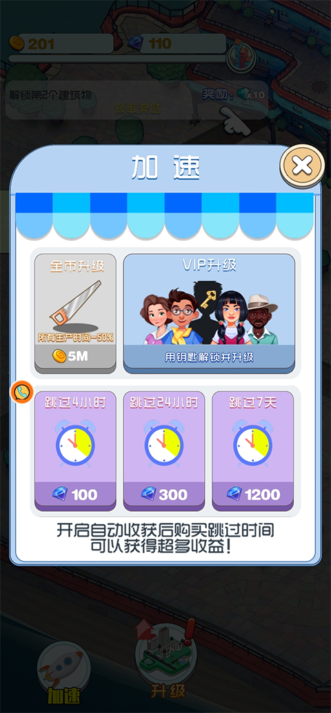 2、通过点击和滑动升级建筑,获得更多资金来源