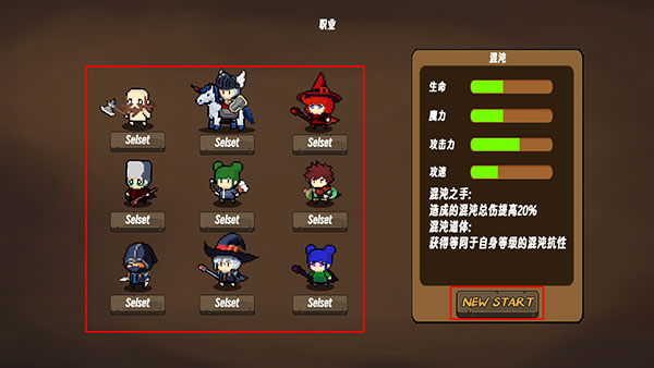 1、进入游戏,首先我们需要再9位人物里选择一个职业角色,右边有属性显示,点击“NEW START”;